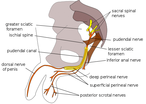 El nervio pudendo es un nervio sensitivo, motor y del sistema nervioso autónomo que nace de las raíces sacras y que a continuación se dirige hacia la pelvis para dar sus tres ramas terminales: el nervio dorsal del pene o del clítoris, el nervio rectal inferior y el nervio perineal.